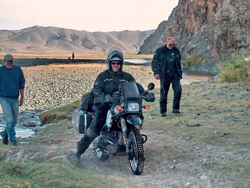 Inzwischen ist es 17:00! Wo die letzten Stunden geblieben sind? Keine Ahnung. Aufsitzen und raus aus der Stadt. Am Nordrand von Bayankhongor entdecken wir im Vorbeifahren noch eine Tempelanlage. Kurze Schleife um die nicht allzu malerisch gelegenen Stupas, ein paar Fotos, das war’s. Wir haben jetzt keinen Nerv für eine ausgiebigere Besichtigungstour. Am Ende des üblichen Zaun-Jurten-Meeres finden wir die Piste. Sie verläuft entlang eines größeren Flusses in einem etwa einen Kilometer breiten Tal. Wir fahren, eher schlecht denn recht, durch den groben Schotter.