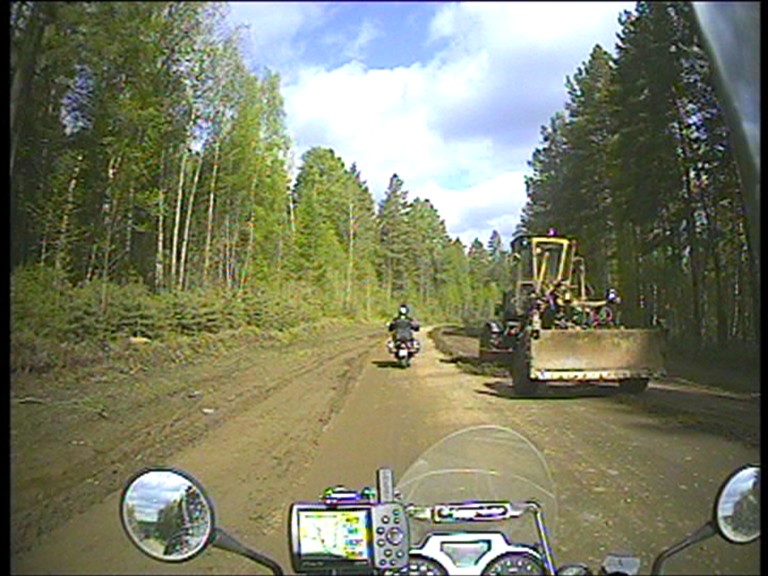 Nach etwa 200 km Gerödel über diese üblen Pisten werden wir bei Tayshet wieder mal kontrolliert. Der Herr Gendarm ist richtig nett und witzig, so dass es uns regelrecht geärgert hat kein Russisch zu können, um ein bisschen mit ihm zu schäkern. Auch ihm ist ein kleiner Plausch mit den fremden Motorradfahrern lieber, als die Kontrolle irgend- welcher Papiere.