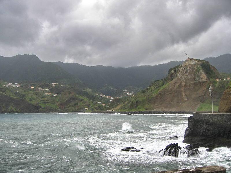 Heute Morgen sieht das Wetter nicht ganz so gut aus wie gestern, aber es ist immerhin trocken. Von Canico fahre ich Richtung Norden in die mit Wolkenschwaden durchzogene, und damit etwas mystisch anmutende Bergwelt. Ab der Passhöhe bei Portela folge ich einem Pickup, der ein Kalb auf der Ladefläche befördert, die Straße nach Porto da Cruz hinunter. Das arme Vieh macht sich, vor Angst über den etwas rigiden Fahrstil seines Chauffeurs, ständig in die nicht vorhandenen Hosen, was der Griffigkeit seiner Hufe auf der Ladefläche nicht gerade zuträglich ist. Unermüdlich rappelt es sich nach jeder Kurve wieder auf.