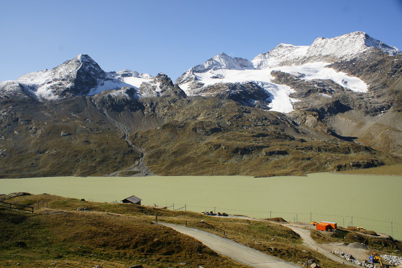 Und weil wir grad so schön beim Pässe fahren sind, düsen wir noch schnell den Passo del Bernina (2330m) bis zum Hospiz hinauf. „Höchststrafe“ meint oben Christian verschmitzt grinsend und spielt dabei auf ein paar andere Motorradfahrer an, die wir in einer Rechtskurve zügig „außen“ überholt hatten. ;-)) Am Hospiz noch ein kurzer Blick auf den See und den inzwischen schon weit abgeschmolzenen Gletscher. An solchen Stellen wird die Klimaerwärmung auch für Laien gut sichtbar.