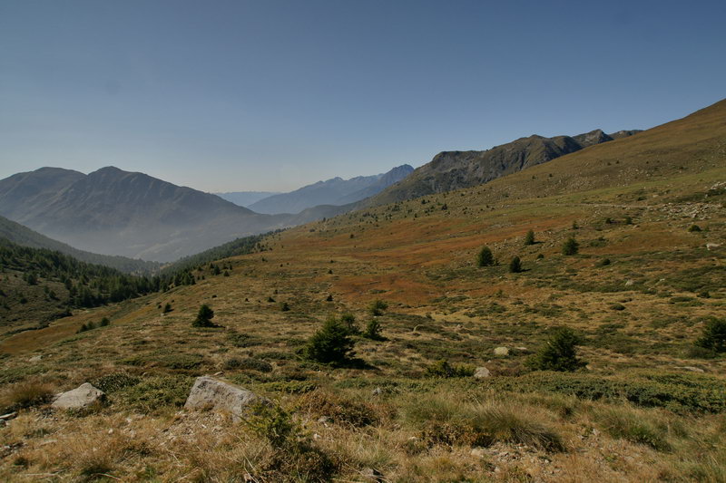 Dieses Mal landen wir in einem Hochtal, das zwar landschaftlich recht reizvoll ist, uns aber letzt- endlich zur Umkehr zwingt. Wir finden keinen legalen Weg ins Tal nach Monno hinunter und nachdem hier anscheinend eine mittlere Jäger-versammlung stattfindet, wollen wir auch nicht austesten, inwieweit Motorrad-Klamotten Schrot- schüsse abhalten können. Von Monno nach Edolo und dort wieder gleich den Gegenhang hinauf. Oben gibt es ein paar Kilometer Schotter, aber ansonsten eigentlich uninteressant.