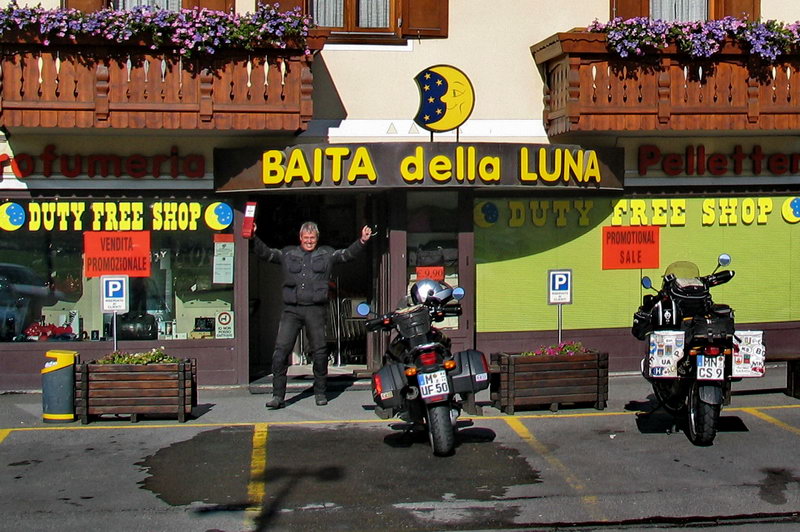 Der Verkehr ist recht rege, da Livigno italieni- sches Zoll-Ausland ist und samstags wohl die Bevölkerung aus einem Radius von mindestens 100 km zum Shopping lockt. Mich zieht es dorthin, da dort auch Zigaretten deutlich günstiger zu haben sind und außerdem können wir unsere Tanks mit steuerfreiem Sprit füllen. Macht so 30 Cent Ersparnis pro Liter. Zwanzig Minuten später verlassen wir das Hochtal Richtung Süden wieder. Über den Forcola di Livigno (2310m) fahren wir hinüber in die Schweiz.