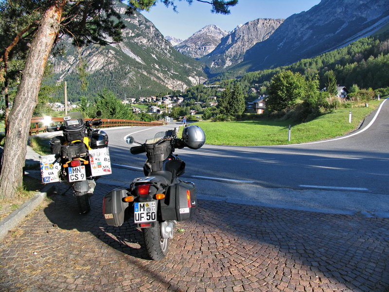 Nicht allzu spätes Aufstehen und Frühstücken. Wie üblich alles zusammenpacken und auf die Bikes verladen, die die Nacht vor dem rückwär- tigen Hauseingang verbracht hatten. Der erste Halt gleich an der Einfahrt zum Hotel- gelände. Auch wenn es noch herbstlich kühl ist, beleuchtet die Sonne die Berge doch recht fotogen und Christian muss noch irgendwas an seinem Navi schrauben. Wir fahren ins Tal hinunter, lassen aber Bormio selbst links liegen, und wenden uns direkt nach Westen. Über das nicht so bedeutende Formarinjoch (1871m) steuern wir Livigno an.