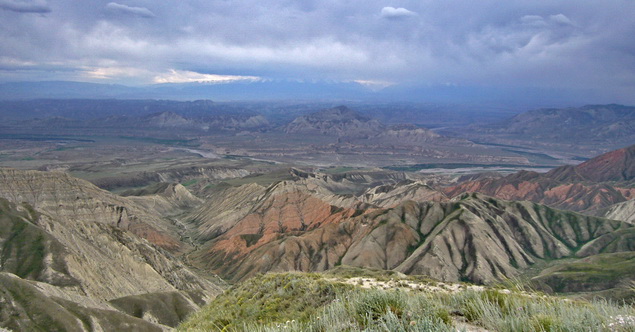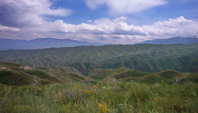 In Kazarman gestaltet sich die Tankerei etwas zäh. Die Dame im Kassenhäuschen kann nicht ganz glauben, daß wir die bestellten 40 Liter auch tatsächlich fassen können. Mindestens fünf Mal schaltet sie die Pumpe ab, bis wir endlich die gewünschte Menge haben. Hinter Kazarman folgt ein weiterer 3000er Paß über eine grandiose Berglandschaft.