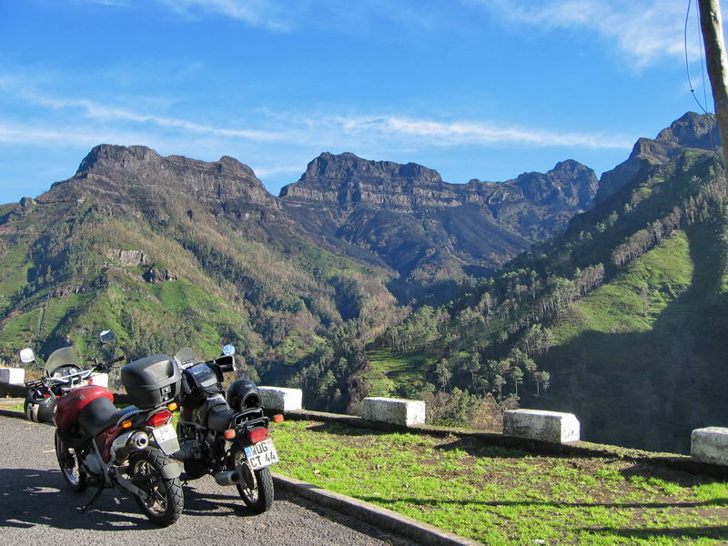 Heute steht „geführte Motorradtour“ auf dem Plan. Joe hat dienstags Ruhetag und somit Zeit mir „seine“ Insel zu zeigen. Gegen zehn Uhr ziehen wir bei strahlendem Sonnenschein und fast wolkenlosem Himmel los. An Funchal vorbei biegen wir in ein tief eingeschnittenes Tal nach Norden ab. Am linken Berghang windet sich ein kleines Sträßchen, bis zur Passhöhe auf ca. 1000m hinauf. Die Strecke war eine der früheren Nord- Süd-Verbindung der Insel, die mittlerweile ein ordentliches Loch durch den Berg unten im Tal ersetzt.