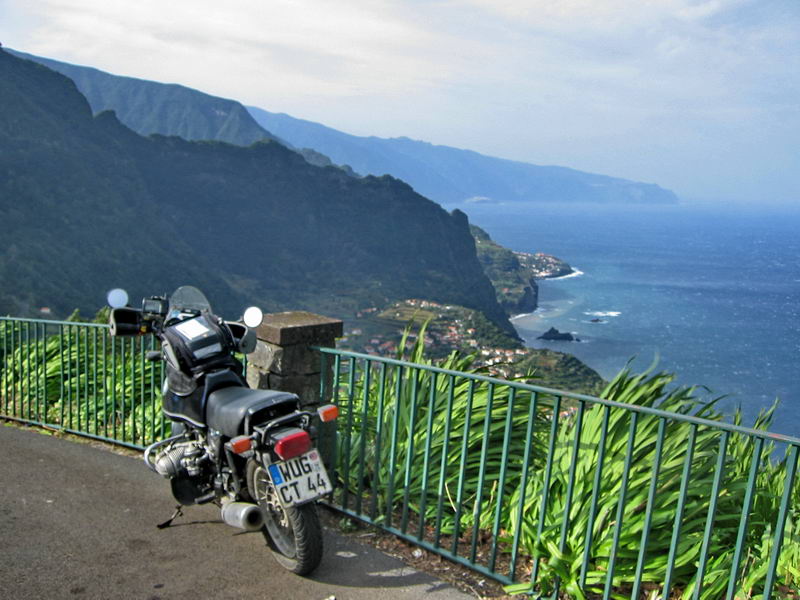 Heute Morgen sieht das Wetter nicht ganz so gut aus wie gestern, aber es ist immerhin trocken. Von Canico fahre ich Richtung Norden in die mit Wolkenschwaden durchzogene, und damit etwas mystisch anmutende Bergwelt. Ab der Passhöhe bei Portela folge ich einem Pickup, der ein Kalb auf der Ladefläche befördert, die Straße nach Porto da Cruz hinunter. Das arme Vieh macht sich, vor Angst über den etwas rigiden Fahrstil seines Chauffeurs, ständig in die nicht vorhandenen Hosen, was der Griffigkeit seiner Hufe auf der Ladefläche nicht gerade zuträglich ist. Unermüdlich rappelt es sich nach jeder Kurve wieder auf.
